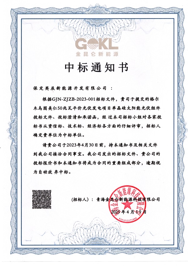 近日,凯发k8体育APP旗下保定英辰新能源开发有限公司(下称“英辰新能源”)收到中标通知书,公司成功中标青海格尔木乌图美仁50兆瓦平价光伏发电项目。