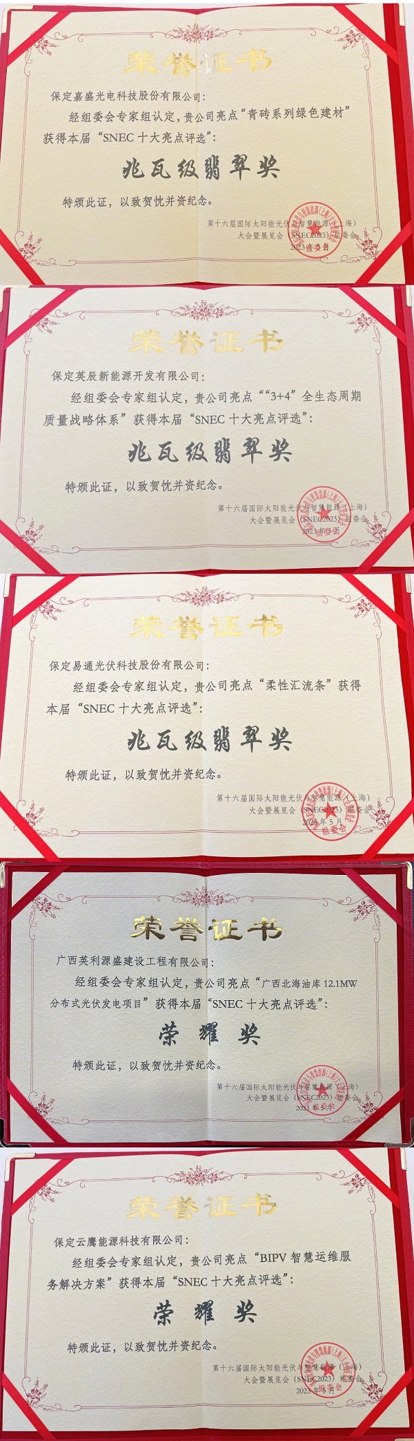 5月26日,SNEC上海光伏展“十大亮点”颁奖典礼在上海新国际博览中心举行。凯发k8体育APP凭借光伏智造全生态周期质量体系、新一代光伏绿色建材、光伏配套材料、工商业光伏优秀案例以及BIPV智慧运维解决方案等,荣获“十大亮点”兆瓦级翡翠奖和荣耀奖多项大奖。