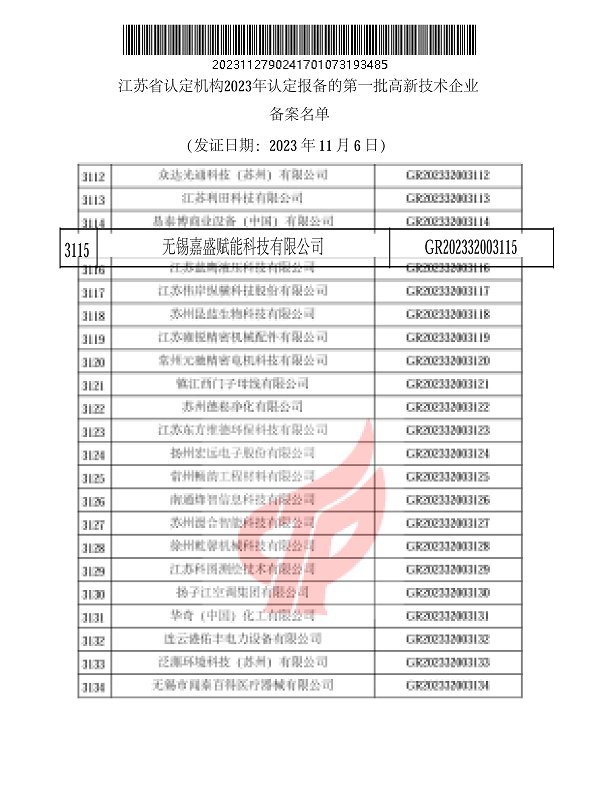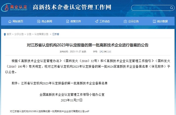 日前,全国高新技术企业认定管理工作领导小组办公室发布江苏省认定机构2023年认定报备的第一批高新技术企业备案名单,凯发k8体育APP旗下无锡嘉盛赋能科技有限公司(下称“凯发k8嘉盛”)凭借持续的科技创新能力及众多转化成果,顺利通过“高新技术企业”认定。